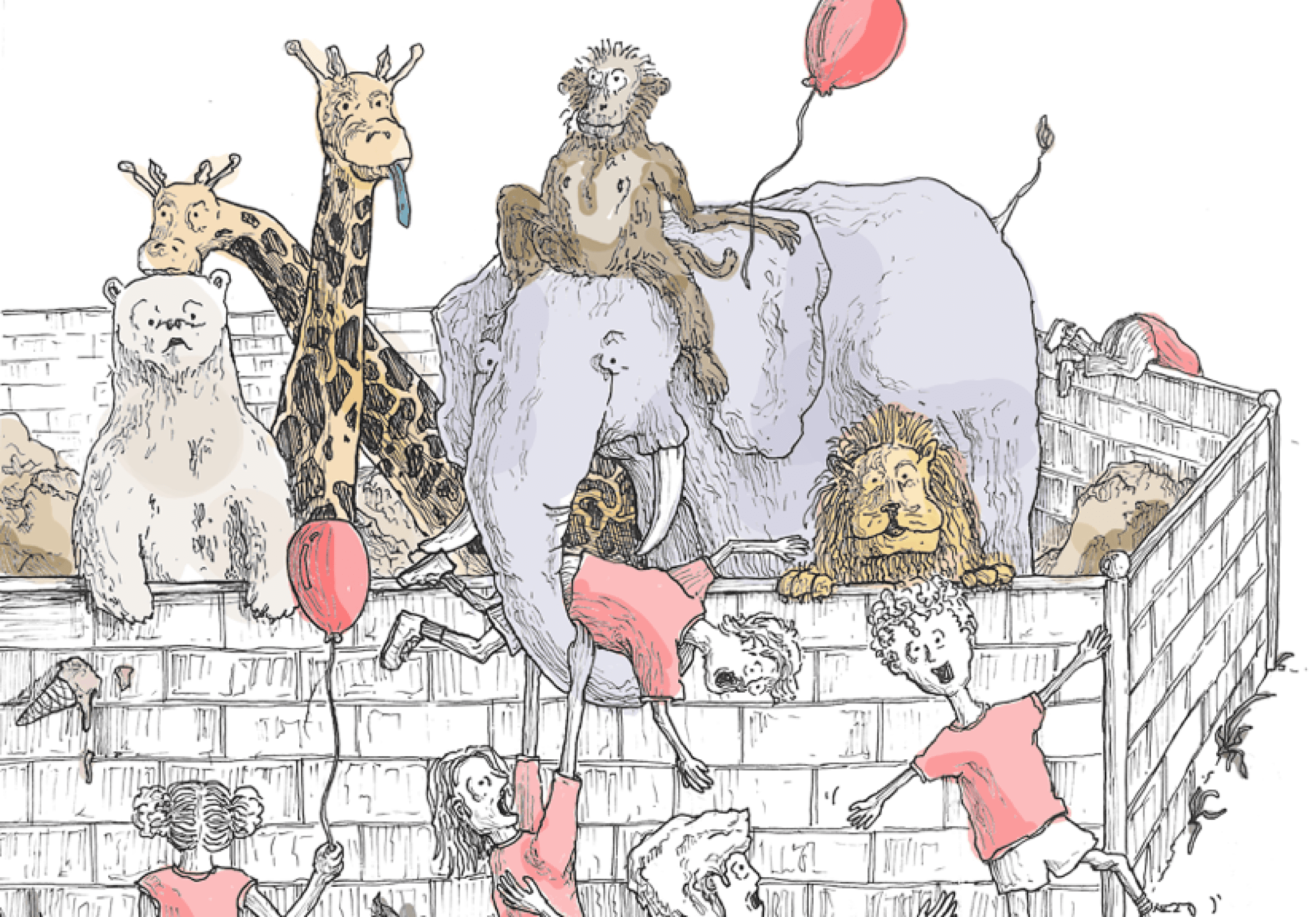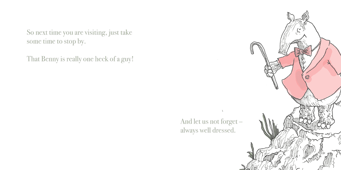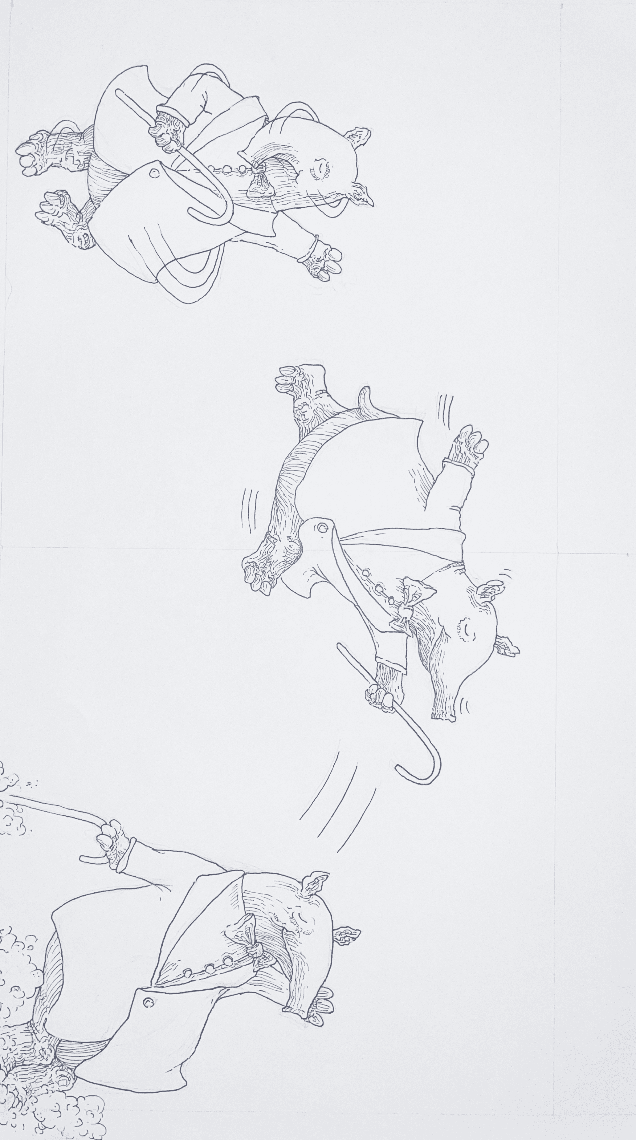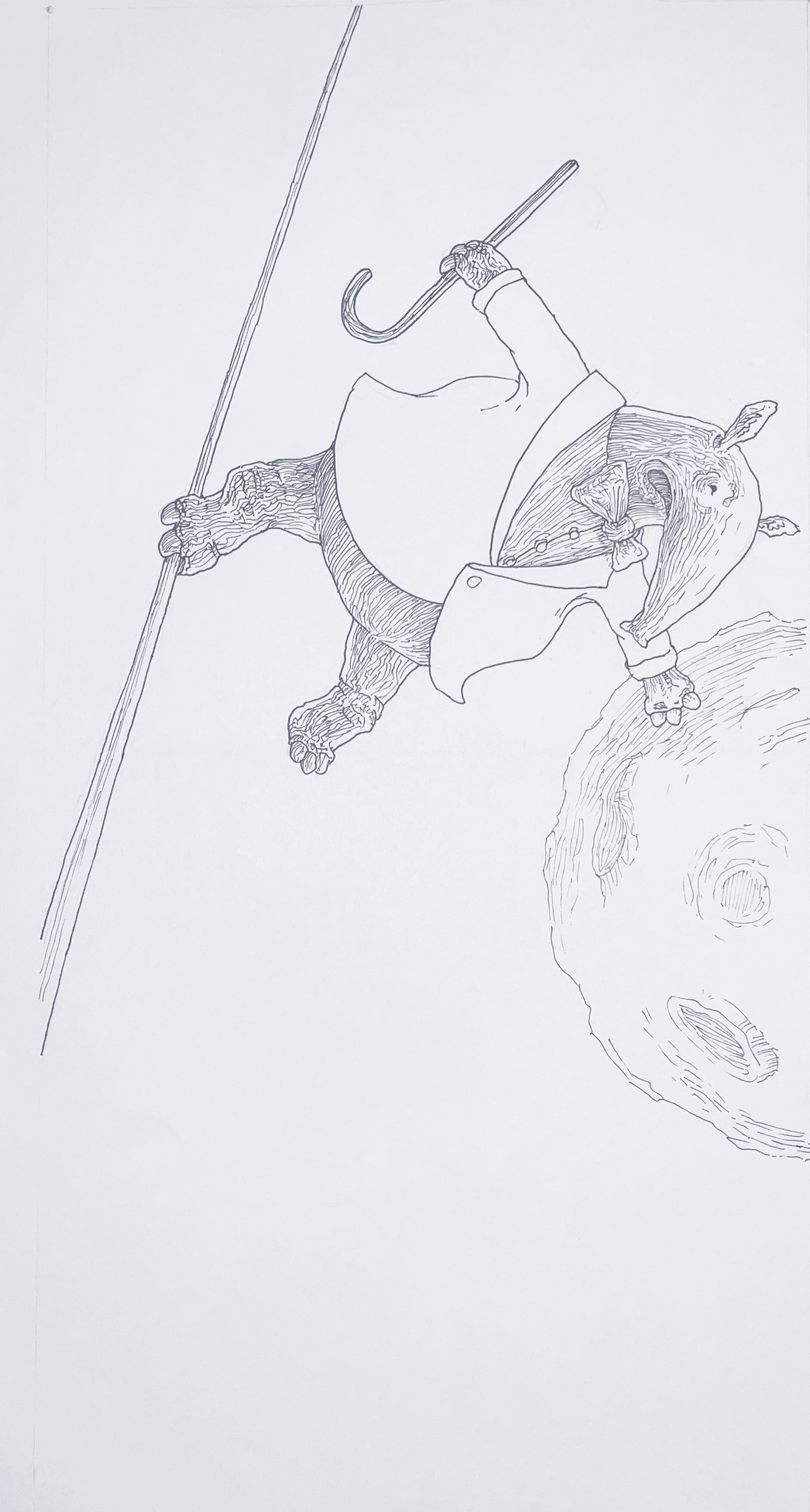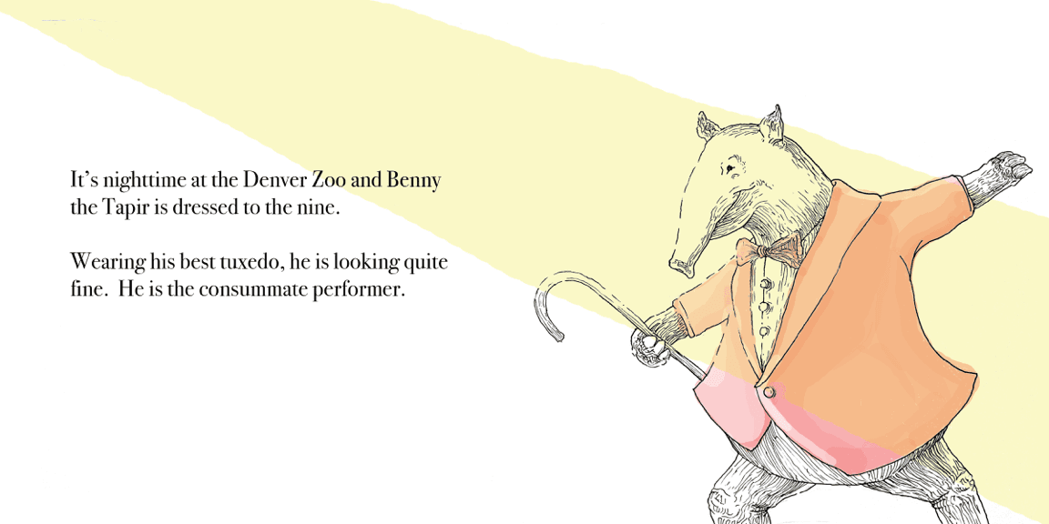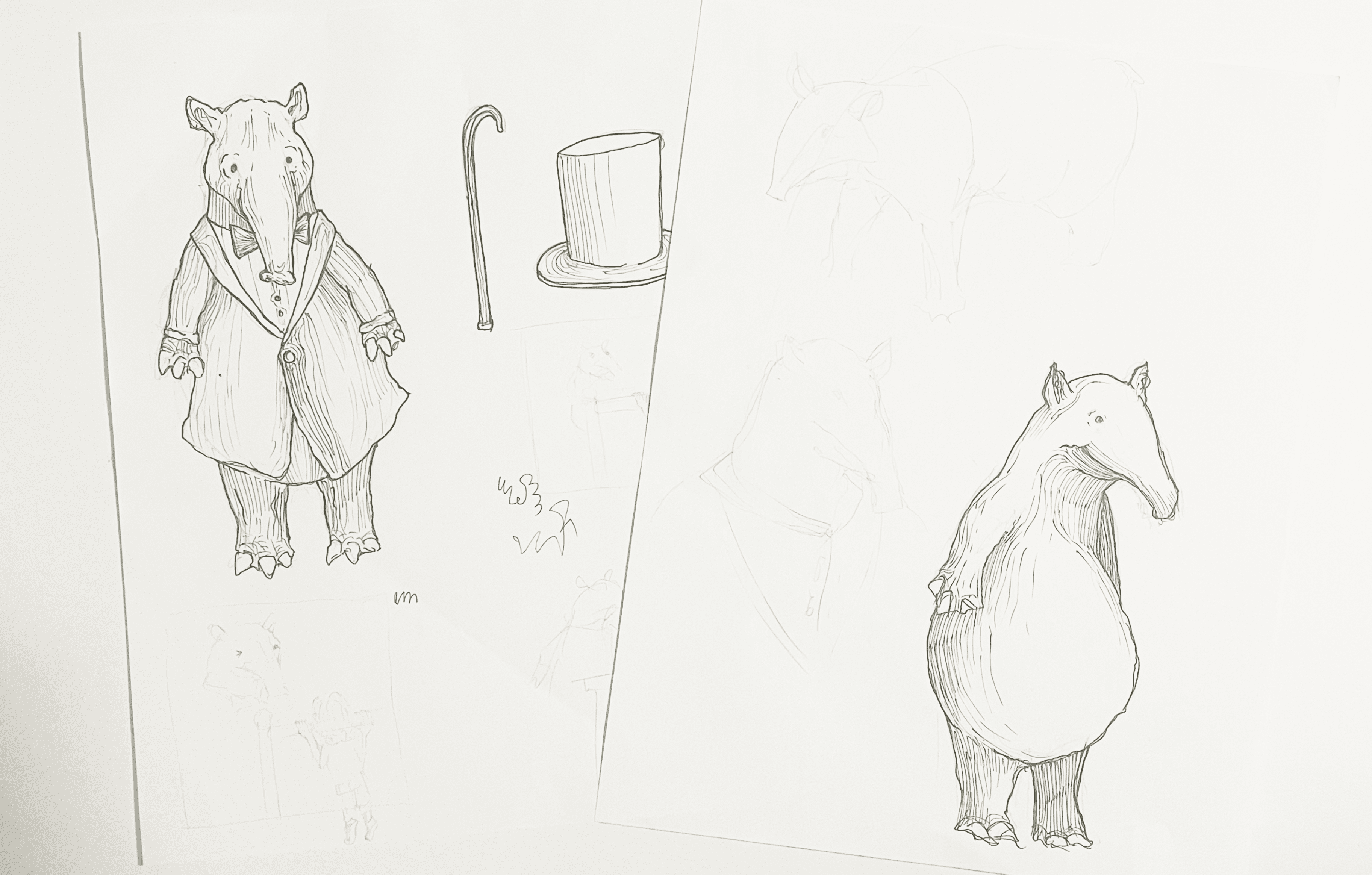 it is specified in the story that the tapir wears a tuxedo, so I needed to make it stand on its back legs - this required some artistic/biological liberties