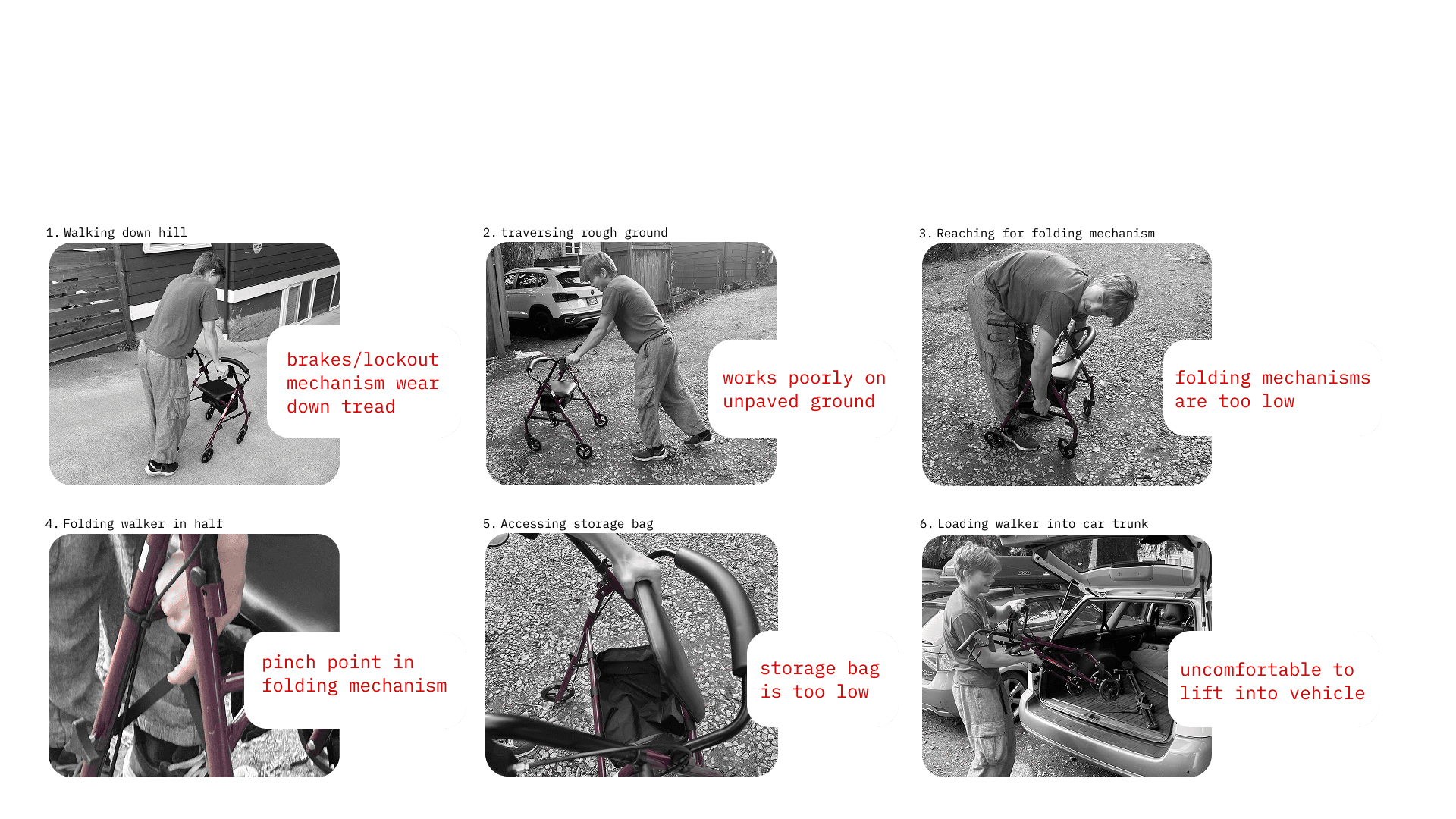 We had a user demonstrate common rollator walker talks and describe the pain points.
