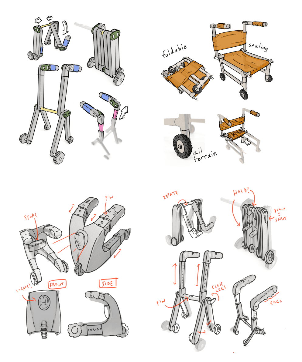 We advanced our prototypes into more detailed sketches. This allowed us to move forward with a concept where the legs and arms fold around a center axis. We felt it was the most efficient, and simplest to understand folding mechanism.
