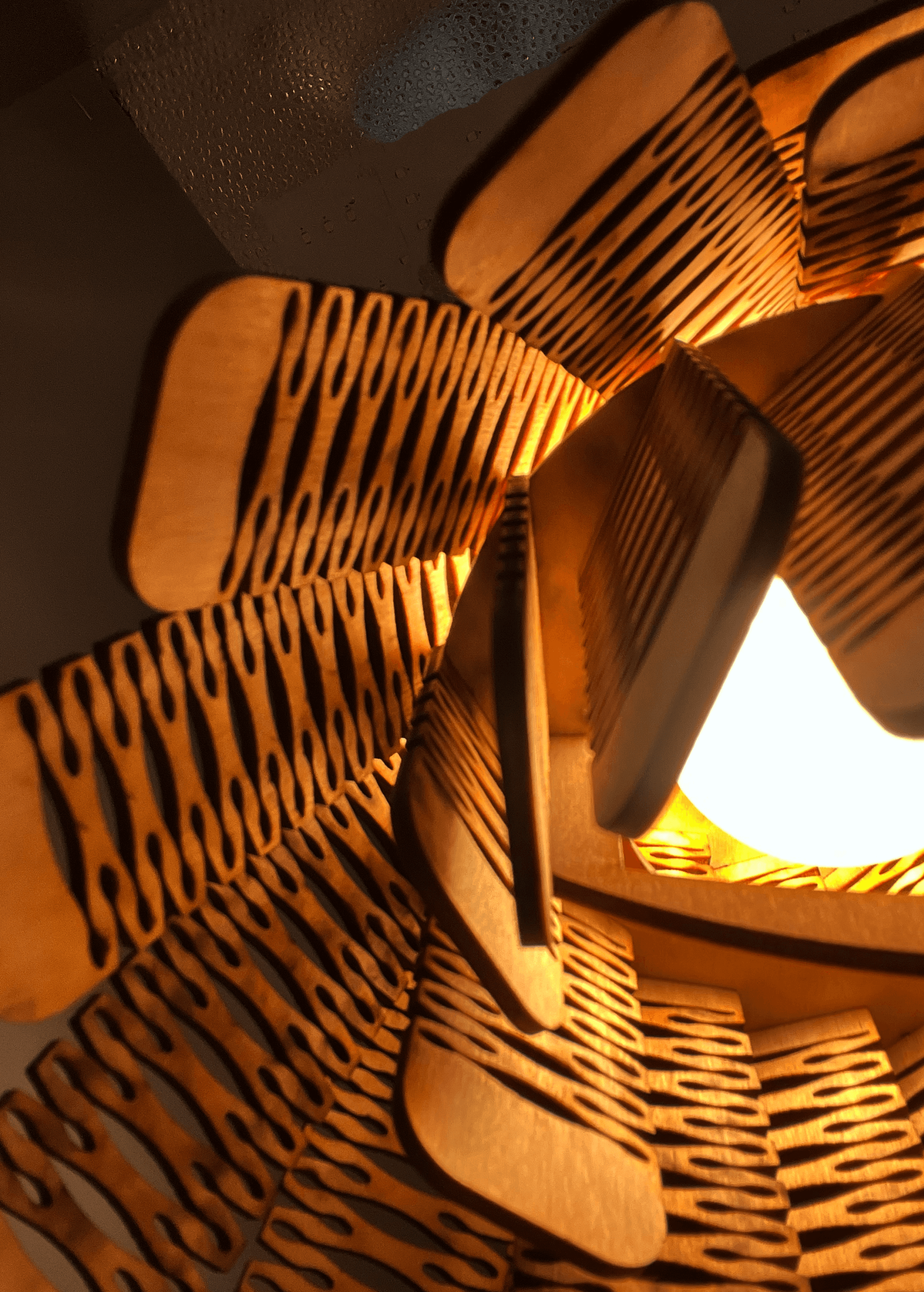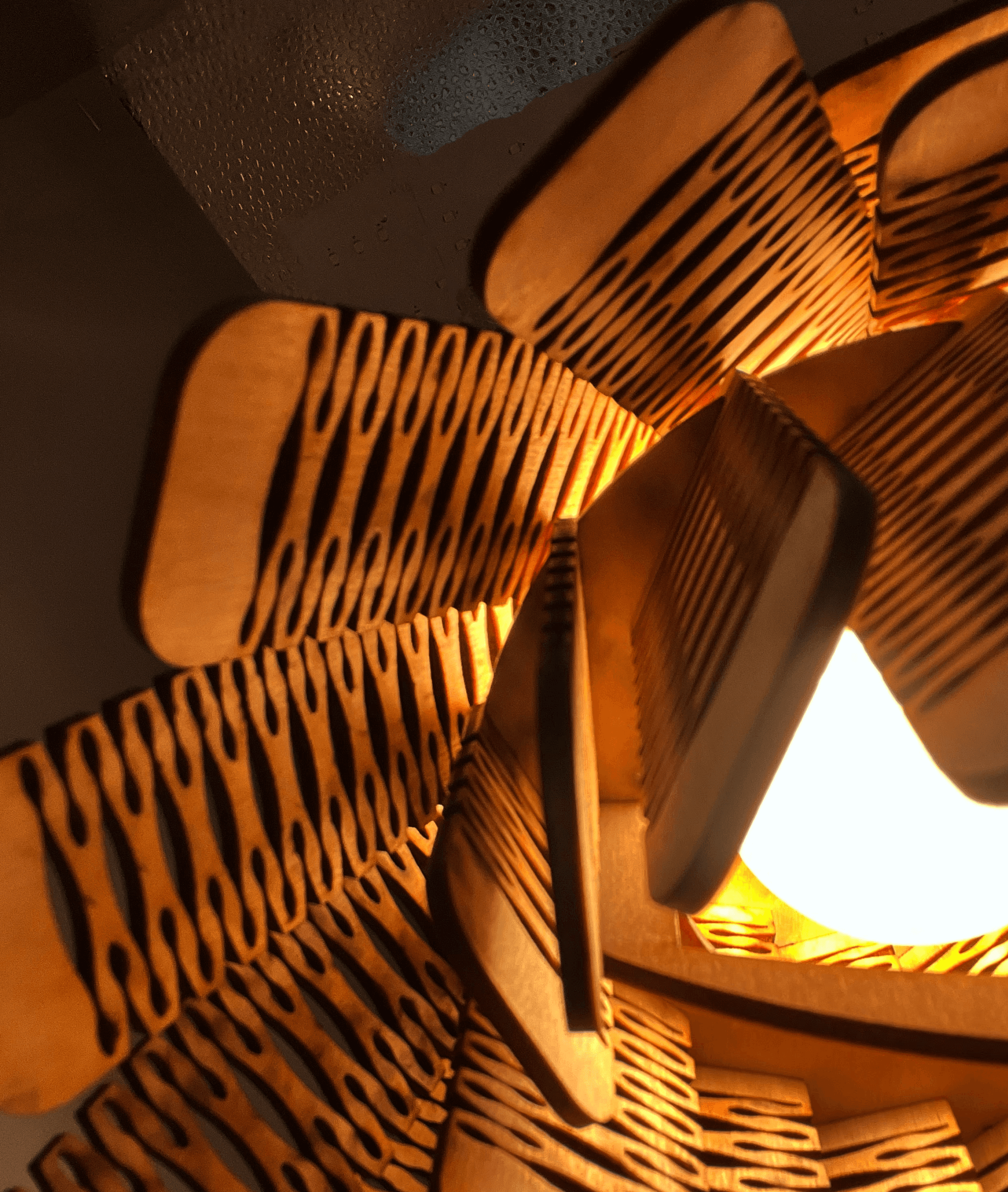 UMBO is a wooden lamp that ships flat-packed, and can be assembled with no adhesive. It utilizes the properties of living hinges to turn a brittle material like wood into a cascading, organic one. It follows a radial pattern, as well as a pattern in each piece, creating unique shadows.