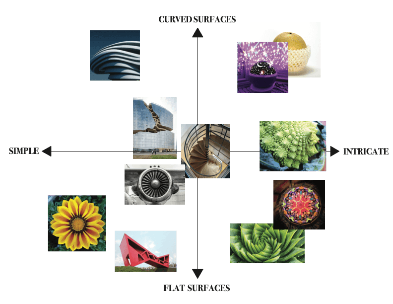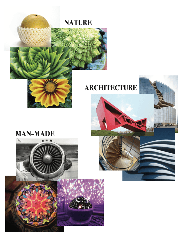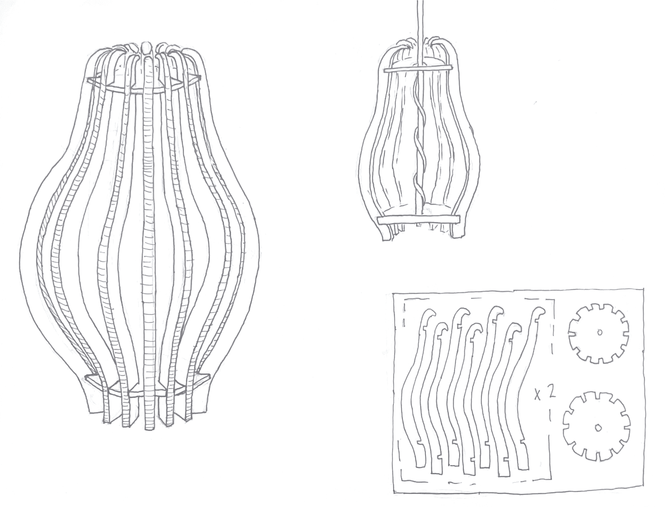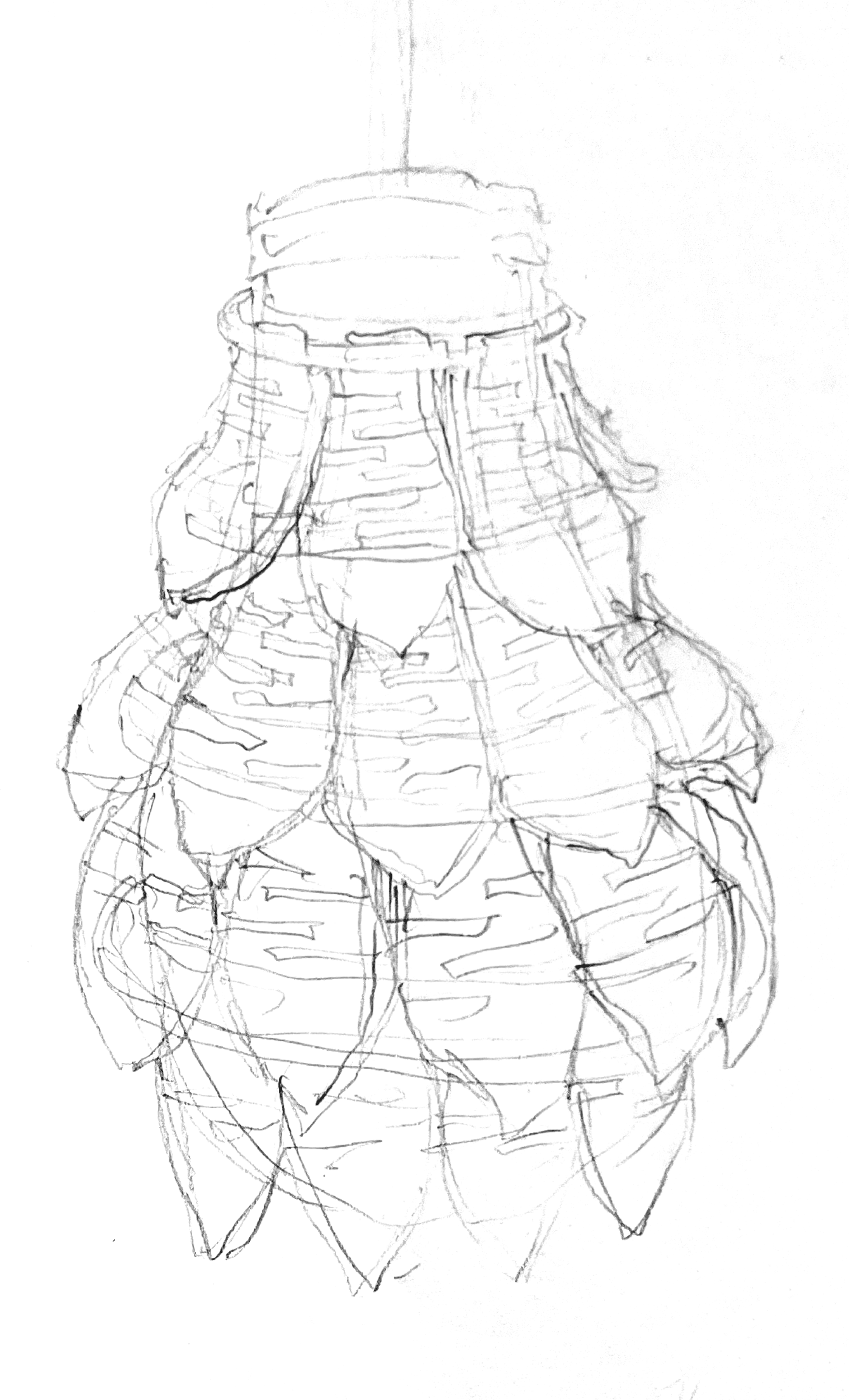 My initial sketches made sure to include different types of living hinges. They focused heavily on organic forms, copying structures from plants, fruits, and other existing lamps. I moved forward with the design shown at right due to its cascading form creating a strong sense of movement.