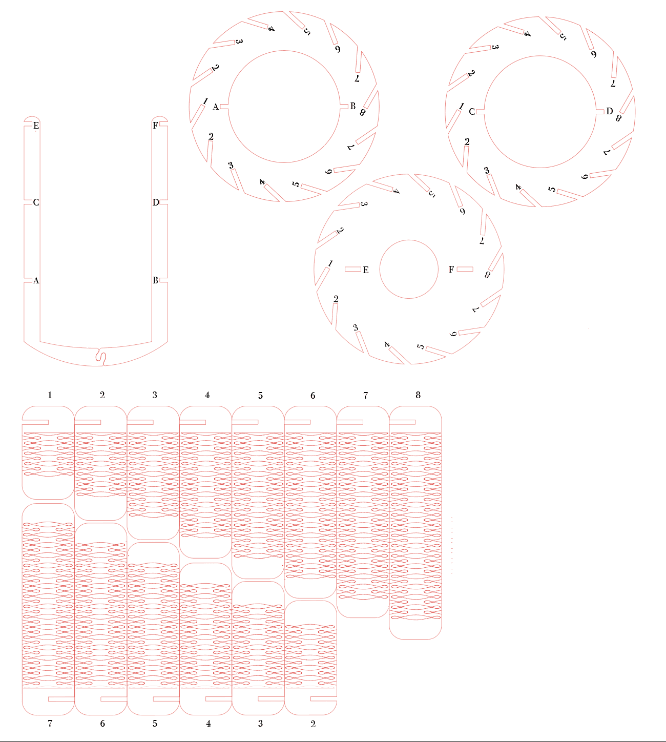 In order to achieve the goal of a flat-packed lamp, I had to create a net for a single sheet of wood. This would allow the pieces to be laser cut and assembled free of tools. The final net ended up being very complex, and uses rastered numbers and letters to indicate where each piece goes.